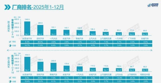 2025年,合资品牌依旧占据了中国乘用车市场的重要地位,但自主品牌的崛起势头不容忽视。根据数据显示,前十大车企中,四家是合资品牌,分别是:一汽大众、上汽大众、一汽丰田和广汽丰田。这些品牌依靠多款新车型的发布,在市场中占有一席之地,尤其是一汽大众,以153.1万辆的销量位居合资品牌之首,稳居燃油车领域的领导地位。