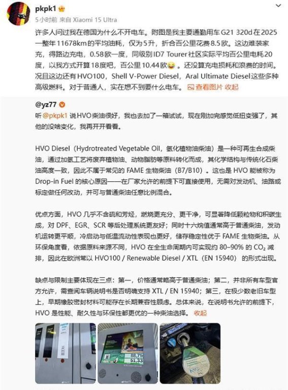 与此柴油车的环保性能正不断改善。博主提到,欧洲市场上已推出一种名为HVO100的高级燃料,这种燃料是通过加氢工艺将废弃植物油和动物脂肪转化而成的可再生柴油。与传统的化石柴油相比,HVO几乎不含硫和芳烃,燃烧更加充分,排放更为清洁,因此不仅能减少颗粒物和积碳的生成,还能有效降低氮氧化物等污染物的排放。HVO还对汽车的排放控制系统更加友好,能够提升发动机的工作效率和使用寿命。