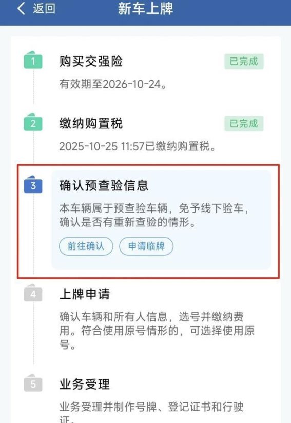 查验信息:车辆需要有厂家预查验信息,或者已经完成线下查验。