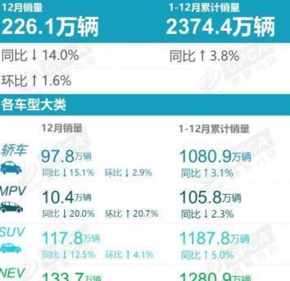 根据中国汽车流通协会乘用车市场信息联席分会最新发布的2025年12月销量数据,国内汽车市场在去年迎来了一些波动。12月的狭义乘用车零售销量为226.1万辆,较去年同期下降了14.0%,但环比微增1.6%。2025年全年累计销量突破2374.4万辆,同比增长了3.8%,顺利完成了“十四五”期间的增长目标。