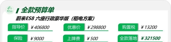 在购车方式方面,蔚来ES8的消费者中,分期付款和BaaS租电方案仍是最为流行的选择。尤其是六座行政豪华版,采用BaaS租电方案后,电池的月租金为1128元,车价为298800元。分期付款和租电的方式使得消费者的购车压力得以分散,同时又能避免电池使用寿命的问题。