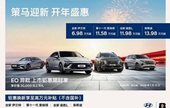 随着2026年新年的到来,北京现代为广大消费者带来了丰富的开年优惠活动。此次优惠活动覆盖了品牌旗下的多款热销车型,包括伊兰特、索纳塔、途胜L、库斯途以及EO羿欧等。优惠力度相当可观,最低价格仅为6.98万元起,部分车型还可享受最高万元的置换补贴,优惠活动持续至2026年1月31日。让我们一起看看这些车型的具体优惠。