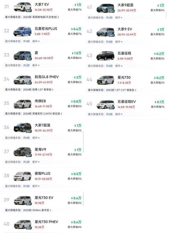 相比之下,新能源MPV(包括插电混合动力和纯电动车型)的价格调整则相对较小。例如,大家7 EV/超混、传祺E8/E9 PHEV等车型的降幅大多在5%以内,部分车型仅有象征性优惠。这主要是由于电池成本和技术定位的影响,新能源MPV的价格体系依然较为稳定。像别克GL8 PHEV、星海V9等车型的降价幅度达到了2万元左右,这预示着随着市场竞争的不断加剧,新能源MPV市场也可能迎来更加激烈的价格波动。