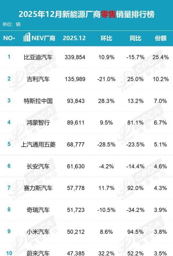 2025年12月,新能源车厂商零售销量排名前十的车企分别为比亚迪、吉利、特斯拉、鸿蒙智行、上汽通用五菱、长安、赛力斯、奇瑞、小米和蔚来。令人瞩目的是,小米汽车成功挤进了12月的销量前十,并且表现异常亮眼。在这一月中,小米汽车的销量达到了50212辆,同比大幅增长了94.5%。与之相对,2025年全年,小米汽车的销量增幅更为惊人,全年销量达到411837辆,同比增长了200.9%,排名第十。这一成绩标志着小米汽车自入局以来,凭借精准的市场定位和高效的营销策略,迅速成为新能源车市场的一匹黑马。