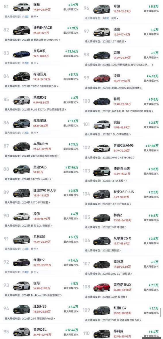 在主流合资品牌方面,大众的探岳、迈腾、朗逸等主力车型的优惠幅度普遍在25%-35%之间,而日系品牌中的轩逸、思域、CR-V等车型也普遍有3-6万元的价格让步。这些车型市场基数大、关注度高,价格下调后进一步拉低了购车门槛,吸引了更多消费者的关注。值得注意的是,这些调整不仅提高了合资品牌的市场竞争力,还直接影响了部分国产同级车型的价格定位。可以看出,在国产新能源车和燃油车的双重挤压下,合资品牌正在重新审视价格体系和市场定位,以确保在激烈的市场竞争中占据一席之地。