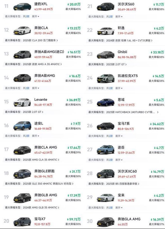 豪华品牌的降价幅度同样惊人,奔驰A级、奔驰GLB等入门车型的优惠接近50%,实际起售价已经进入20万元以内的区间,宝马X1、捷豹XEL等车型也有类似幅度的价格调整。更高端的宝马7系、奔驰S级、奥迪SQ5等车型的优惠金额普遍在15万元以上,部分车型的优惠金额更是超过了30万元。显然,豪华品牌也在应对电动化挑战和市场压力的不得不通过价格调整来维持其在市场中的热度和竞争力。这一变化不仅展示了豪华品牌市场策略的灵活性,也反映出曾经依赖品牌溢价的传统燃油车,正不得不依靠价格手段来保持其市场地位。