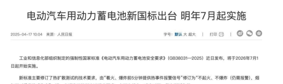 新的《电动汽车用动力蓄电池安全要求》(GB 38031-2025)将于2026年7月1日起正式实施。这一新规的一个显著变化是,将“不起火、不爆炸”设定为强制性要求,而不仅仅是“热失控后给你几分钟预警”的预防措施。这意味着,电池在极端情况下的安全性将得到大幅度保障,车主不再需要担心电池过热或爆炸的风险。