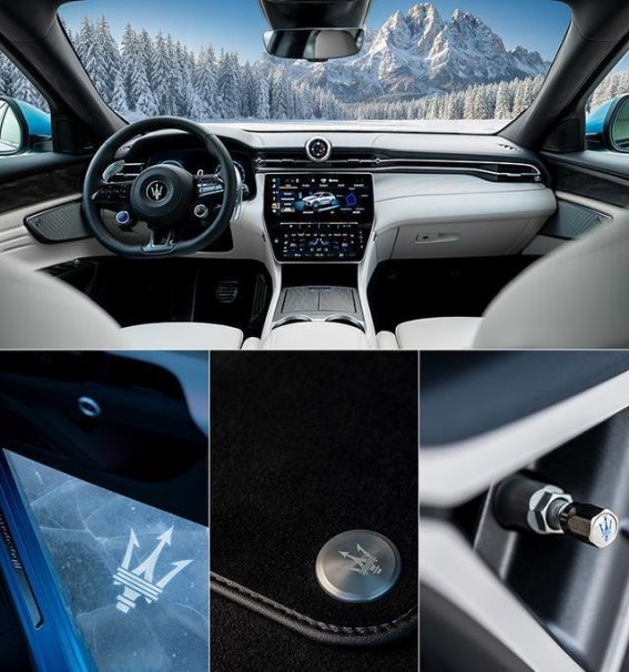 进入车内,Grecale Cristallo的内饰设计让人感受到如同阿尔卑斯山脉般的纯净与自然。车内采用Ghiaccio高级皮革,这种材质在质感和视觉效果上都能带来无与伦比的清新与明亮,完美提升了车内空间的质感。车内的饰面和功能布局也是专门为这款限量版车型定制,既能满足驾驶的舒适性,又不失豪华感。定制迎宾灯与脚踏垫的加入,更加突出了Grecale Cristallo的独特气质。