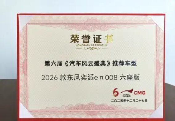 2026款东风奕派eπ008六座版凭借其出色的安全性能、卓越的舒适体验与领先的智能配置,成功获得了第六届《汽车风云盛典》代表车型的殊荣。这不仅是对东风奕派在家庭出行领域的技术创新与深厚积淀的高度肯定,也为未来家庭出行的创新提供了重要参考。东风奕派eπ008六座版作为一款综合性优越的新能源SUV,将引领市场潮流,成为更多中国家庭的首选。