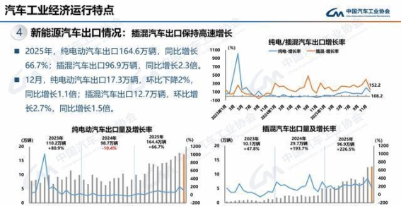插电混合动力车型(插混)在2025年表现尤为突出,全年出口96.9万辆,同比增长了2.3倍。插混车型凭借其较长的续航里程和较低的使用成本,逐步受到国际市场的青睐。作为新能源汽车的重要组成部分,插混车型的出口增长也为中国汽车品牌在全球市场的竞争提供了新的动力。