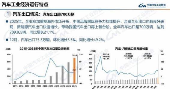 2025年,中国汽车的出口走高,全年出口量突破700万辆,达到709.8万辆,同比增长21.1%。其中,新能源汽车的出口表现尤为突出,新能源车出口达到了261.5万辆,同比翻倍增长,成为出口增长的主力军。这一突破充分展示了中国汽车在全球市场的竞争力,尤其是在新能源车领域,中国已经成为全球供应链中不可忽视的力量。