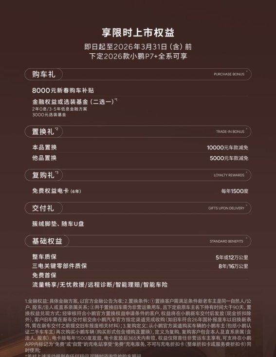2026款小鹏P7+是一款集智能科技、豪华舒适与长续航于一身的新能源轿车。它不仅在外观和内饰设计上有了质的飞跃,更在动力系统、智能化配置和舒适性上进行了全面的提升。对于那些追求高品质生活、注重智能科技和长途驾驶体验的消费者来说,2026款小鹏P7+无疑是一个非常值得选择的理想之选。借助它强大的综合性能,未来的出行将变得更加智能、舒适与便捷。