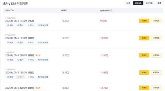 2026款宋Pro DM推出了五个不同配置的车型,售价区间在10.28万到13.08万之间,而优惠后最低仅需9.98万元。这一价格使得宋Pro DM成为了同级别车型中的一个重要选择,那么面对多种配置,消费者究竟该如何做出选择呢?我们接下来将详细分析这五款车型的不同特点,帮助大家找到最适合的版本。