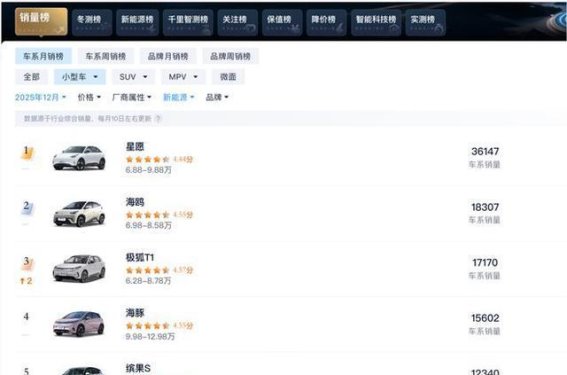 极狐T1的销量表现不仅限于北汽体系。在整体市场中,极狐T1也展现出了强大的竞争力。2025年12月,极狐T1的销量超越了比亚迪海豚,成为新能源小型车榜单上的第三名,仅次于吉利星愿和比亚迪海鸥。这一成绩足以证明,极狐T1不仅具备了较高的市场认可度,同时也展示了北汽在新能源车领域的竞争力。