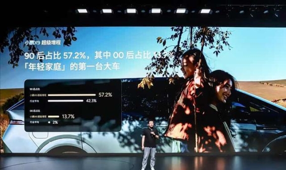 在过去,MPV常被视为商务车型的代表,面向的消费者多为中年及商务人士。小鹏X9超级增程的出现,颠覆了这一传统认知。根据小鹏汽车的最新数据显示,在其用户群体中,90后占比高达57.2%,00后占比13.7%,这一比例远高于其他同类车型。这意味着,小鹏X9的用户群体相比传统MPV要年轻10岁以上,突显了这款车的年轻化趋势。