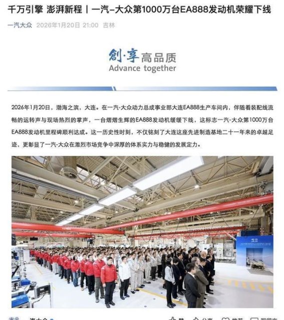 2026年1月20日,一汽-大众迎来了一个标志性的时刻,第1000万台EA888发动机在大连的生产车间正式下线。这一成就不仅彰显了该公司在发动机技术领域的持续创新,也体现了其在全球汽车工业中的领先地位。作为一款已经历五次技术迭代的发动机,EA888以其卓越的动力性能、燃油经济性及可靠性,成为一汽-大众品牌的核心竞争力之一,为众多消费者提供了卓越的驾驶体验。