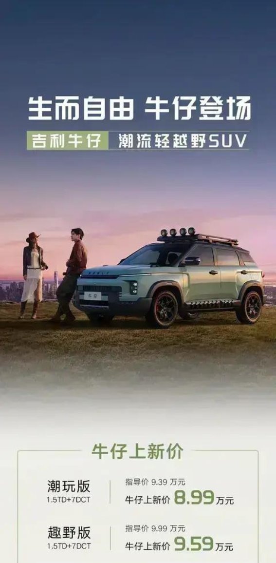 在如今汽车市场的竞争愈加激烈的背景下,越野SUV的需求不断增长,尤其是兼具城市舒适性和轻度越野能力的车型,越来越受到消费者的青睐。吉利作为国内知名的汽车品牌,早已在SUV市场深耕多年,凭借技术创新与时尚设计,不断推出一系列符合市场需求的车型。今天,我们要聊的正是吉利的首款轻越野SUV——牛仔。这款车不仅继承了吉利家族一贯的高品质标准,还以8.99万元的起售价给消费者带来了极具竞争力的选择。
