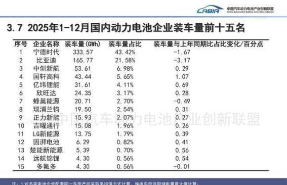 在电池企业的市场份额上,宁德时代与比亚迪依旧占据了市场的绝对主导地位。宁德时代凭借333.57GWh的年装车量,牢牢把握住了43.42%的市场份额,位居榜首。比亚迪紧随其后,年装车量为165.77GWh,占比21.58%。两家公司合计占据了65%的市场份额,尽管这一比例较2024年有所下降(69.82%),但两者的市场地位仍然稳固无比。比亚迪的电池以自用为主,外部供应的主要客户包括小米和小鹏汽车。