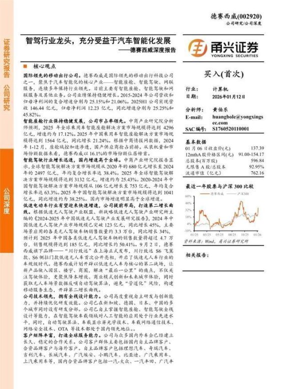 德赛西威凭借在智能座舱、智能驾驶和网联服务等核心领域的持续创新,已经站在了汽车智能化的浪潮前沿。通过技术研发与市场布局的有力推动,公司不断拓展自身的技术边界,并在全球市场中占据了重要位置。随着智能化技术的不断进步和市场需求的进一步增长,德赛西威将为推动全球汽车产业的智能化转型做出积极贡献。德赛西威不仅将在智能座舱和智能驾驶领域巩固其领先地位,还将通过持续创新与技术突破,进一步提升汽车智能化水平,引领行业向着更智能、更便捷、更绿色的未来迈进。