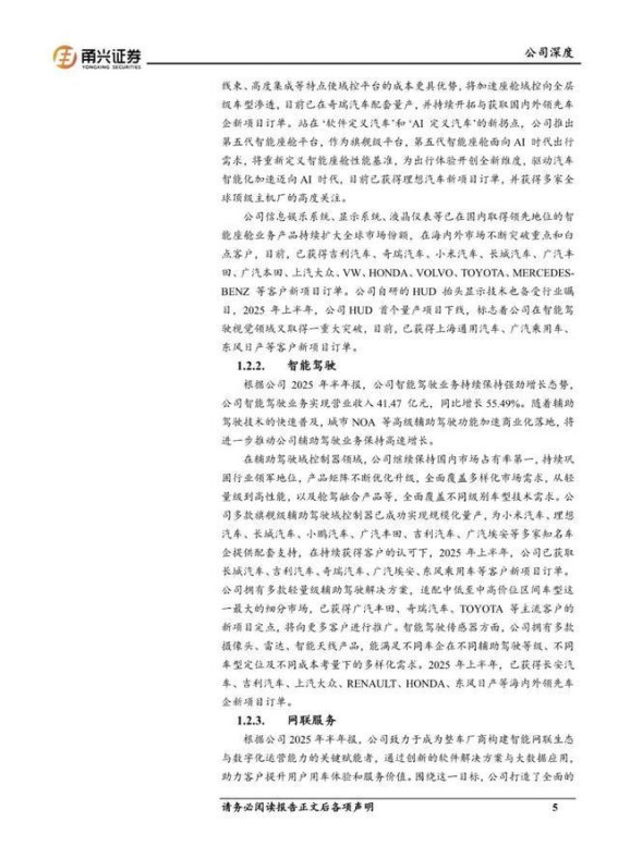 智能驾驶作为德赛西威的另一大核心业务,始终是其技术创新的重点领域。随着自动驾驶技术的不断成熟,智能驾驶已逐渐成为汽车行业的“风口”。德赛西威通过持续的技术研发,积极推进智能驾驶技术的商业化应用,成为行业内的重要推动者。公司在智能驾驶领域的技术布局涵盖了驾驶辅助系统、自动驾驶技术以及相关软件和硬件的全方位解决方案,形成了较强的技术壁垒和市场竞争力。在与国内外汽车厂商的深度合作中,德赛西威的智能驾驶产品得到了广泛应用,并取得了显著的市场表现。随着智能驾驶技术的进一步升级,德赛西威无疑将在这一领域加大投入,推动行业向更高层次发展。