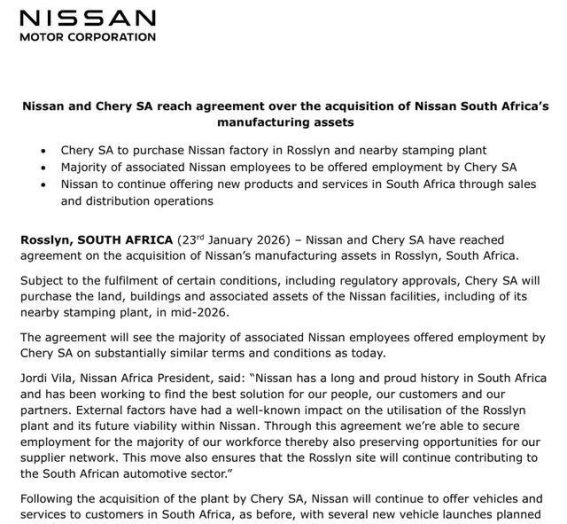 2023年1月23日,日产汽车在其官网发布消息称,已与中国奇瑞集团达成协议,后者将收购日产在南非的罗斯林工厂。根据协议,奇瑞南非公司将在2026年中完成对该工厂的收购,涵盖土地、建筑及相关设施,包括附近的冲压厂。这一消息不仅标志着奇瑞在南非市场的扩展,也意味着日产在全球业务布局中的一次重要战略调整。