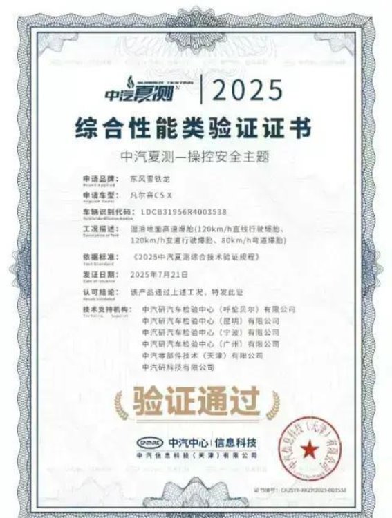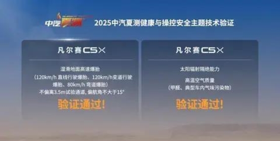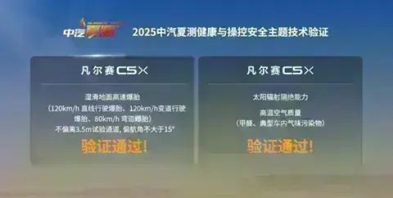 中汽夏测,作为国内汽车行业最具权威的技术验证平台之一,专注于汽车在高温、高湿等极端环境下的综合性能表现。该通过健康安全与操控安全两个核心维度,评估汽车在极端驾驶条件下的表现,推动汽车技术的不断创新。在此次2025中汽夏测中,凡尔赛C5 X成功通过了健康安全和操控安全的双重,不仅展示了法系车的卓越品质,也为消费者提供了更加安全的购车参考。
