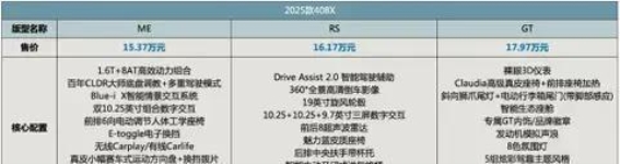 在配置上,2025款标致408X的每一款车型都进行了细致的升级,以满足不同消费者的需求。ME版本作为入门版车型,配备了丰富的配置,如无线CarPlay、E-toggle电子换挡、真皮小幅赛车式方向盘、魔术隐形喷嘴自动雨刮等,不仅提升了车辆的实用性,也让驾驶者在日常用车时更加便捷舒适。而在此基础上,RS版本则增加了Drive Assist 2.0智能驾驶辅助系统、360°全景影像和19英寸旋风轮毂等配置,进一步提升了车辆的安全性与豪华感。旗舰版GT则更为豪华,除了裸眼3D仪表、Focal劲浪HIFI音响等高端配置外,还加入了发动机模拟声浪和多种炫彩驾趣主题,整体车内氛围更加时尚与个性。