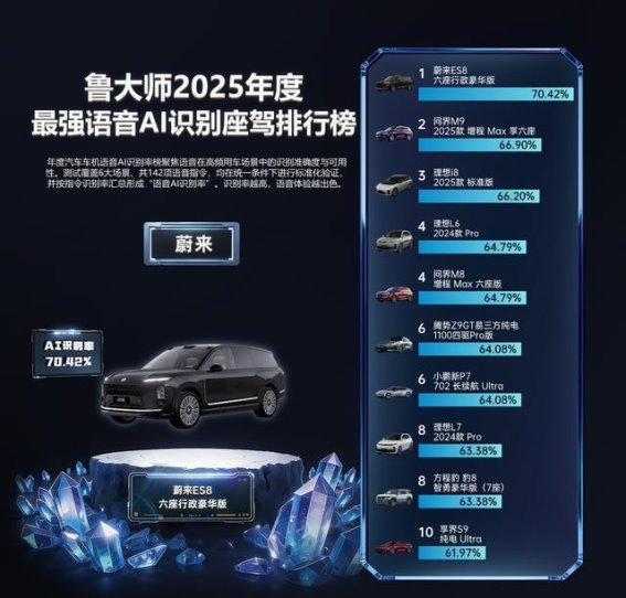 榜单中的前十名车型可谓是智能化的代表:蔚来ES8、问界M9和理想i8占据了前三甲,问界M8与理想L6并列第四,紧接着是腾势Z9GT、小鹏新P7、理想L7、方程豹豹8和享界S9。这些车型无论在语音识别技术还是交互体验上,都展示了行业最前沿的技术,标志着中国车企在智能化道路上的飞跃。